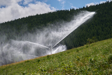 Agricultural sprinkler system irrigating alpine meadow on mountain slope