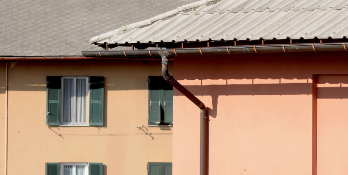 Copper gutter on a sloping roof of an urban house