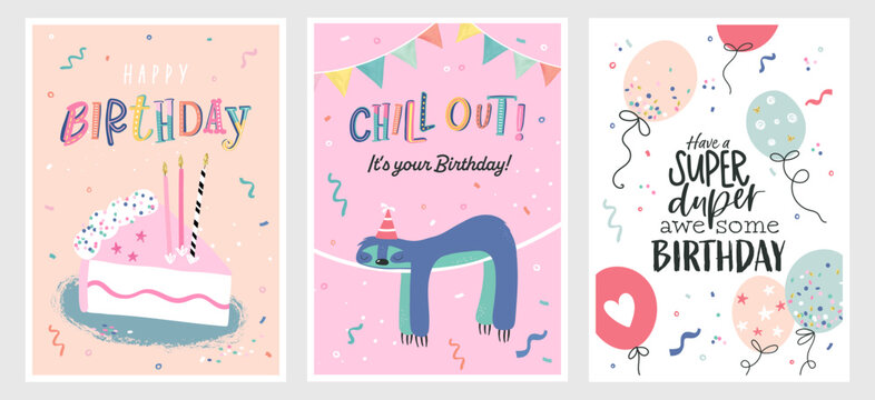 Set of birthday postcards with confetti, garlands, cake and candles. Invitations, happy birthday. Vector templates great for card, poster, flyer or banner