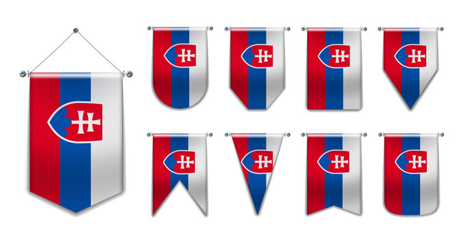 Set hanging flags of the Slovakia with textile texture. Diversity shapes of the national flag country. Vertical Template Pennant for background, banner, web site, logo,award, achievement, festival