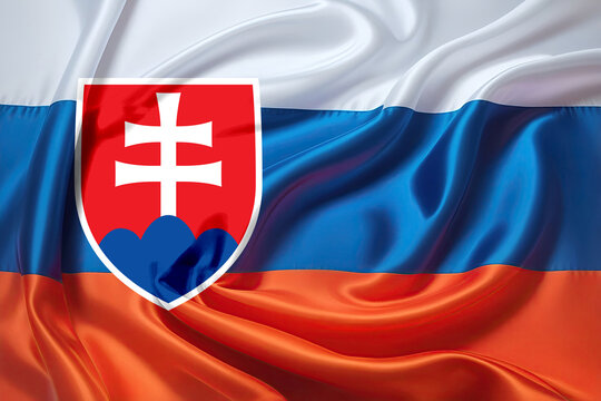 Waving Slovakian flag with coat of arms on fabric texture.