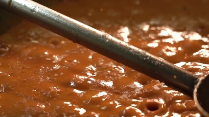 Closeup shot of Cooking thick orange gravy.  Flavour full gravy in pan.