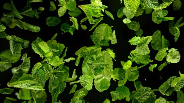 Super Slow Motion Shot of Fresh Mint Leaves Exploded Towards Camera at 1000fps.