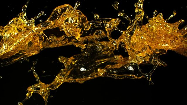 Super Slow Motion Shot of Oil Splashes Flying Towards Isolated on Black Background at 1000fps.