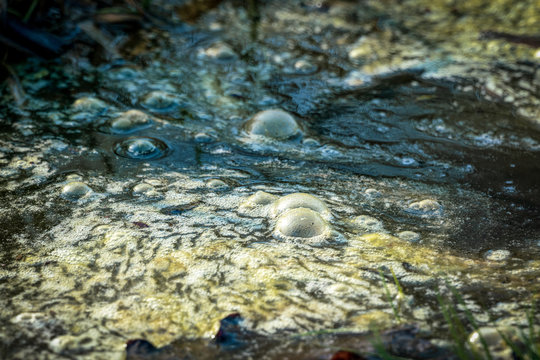 Golden bubbles of sludge gas on a swamp