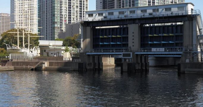 A view of the sluice gate protecting a canal in Tokyo Bay.