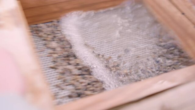 Outdoor adventures on river. Gold panning, man pours sand and gravel into a sluice box in search of gold