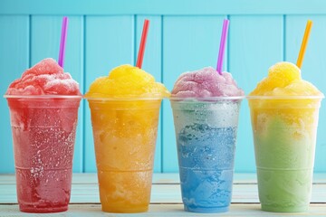 Colorful assortment of refreshing slush drinks in plastic cups