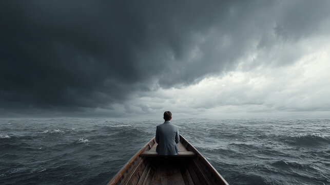 A businessman stands at the back of a small boat in a raging storm, symbolizing leadership, resilience, and navigating challenges to find strategic business solutions.