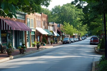 Vibrant colorful storefronts line a charming small town main street with eclectic mix of boutique shops and local businesses on a sunny afternoon.
