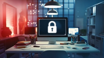 Small office space with computer displaying cybersecurity alert representing importance of cybersecurity for small businesses with soft blur and bokeh