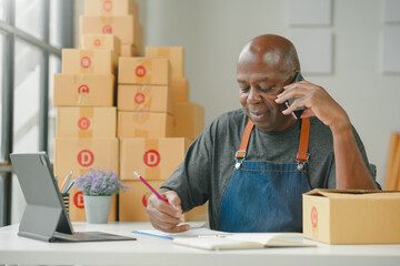 Portrait of bold moustache retired carpenter sitting at his workshop and working with laptop. Small business.