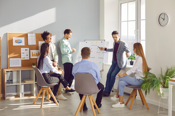 Professional manager, business coach or team mentor having a meeting with a group of multiracial people, standing by the office white board, giving a small speech, and asking questions