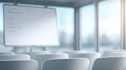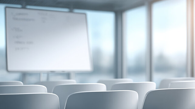 Empty small business meeting room with chairs and whiteboard showing growth strategies for success