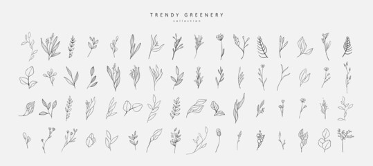 Floral branch and minimalist flowers for logo or tattoo. Hand drawn line wedding herb, elegant leaves for invitation save the date card. Botanical rustic trendy greenery
