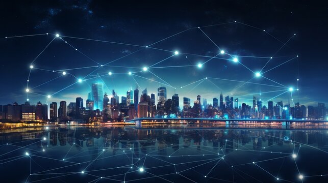 Business illustration: smart city and network connection concept with futuristic technology and urban infrastructure integration