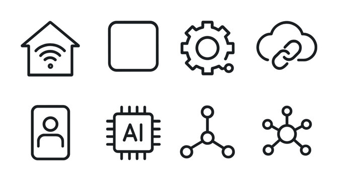 Smart home and tech innovations icon set – outline style for digital transformation, smart devices, and connectivity: smart home, processor, gear, cloud, profile, ai chip, network node, link.