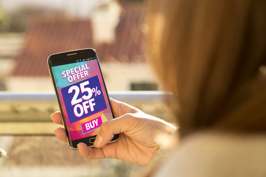 Girl holding a smartphone with a 25% discount advertising on the screen. Marketing, ecommerce, cell phone publicity.
