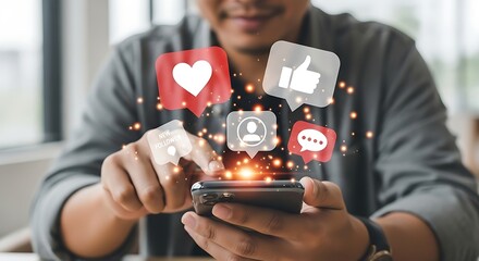A businessman using a smartphone with social media reaction icons such as like, heart, and emoji floating around, representing online communication, digital marketing, and social media engagement.