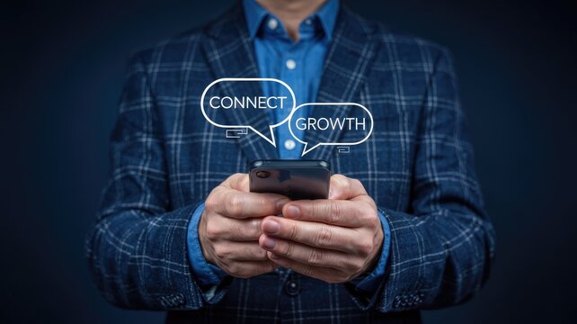 Man in Business Suit Using Smartphone with Startup Rocket Launch Icon, Symbolizing Innovation and Success