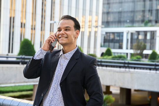 Smiling latin businessman talking on smartphone outdoors