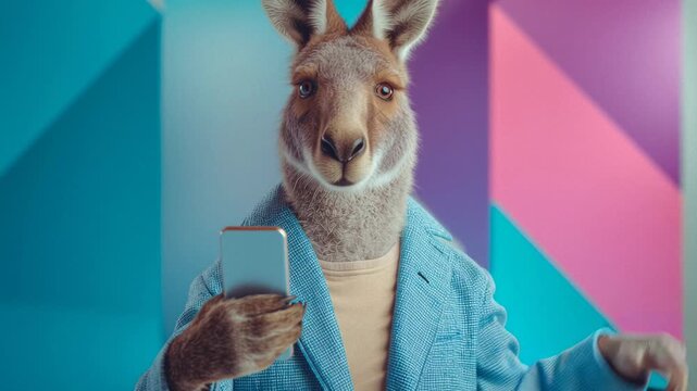 Kangaroo in smart blazer gives presentation while holding phone and sharing information