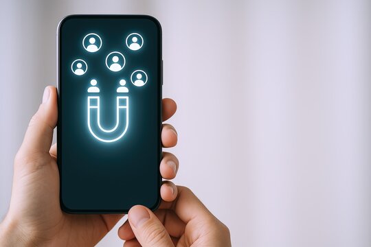 Modern smartphone in hand displaying social media icons with a large magnet symbol background.