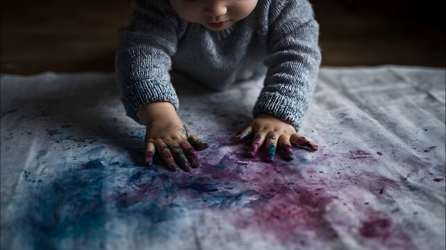 Baby s hands smeared with colorful paint on paper close up view of ic explo n