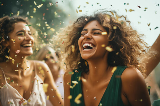 Exuberant young women laughing amidst a cascade of confetti in outdoor party. Generative AI.