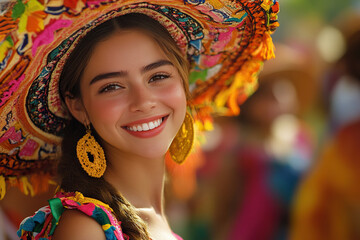 Beautiful Spanish woman in a huge hat at the festival. National hispanic heritage month