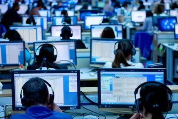 Busy call center with operators fielding customer calls and providing assistance, their desks adorned with headsets and computer monitors, Generative AI