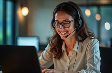 Smiling woman works on laptop using headset, glasses in office. Happy tech support agent provides customer service. Pro communication in modern workplace. Positive, friendly tech support expert.