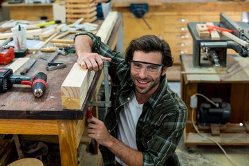 Smiling carpenter with protective gear ready for carpentry service