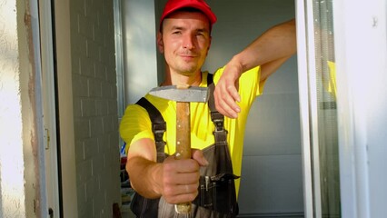 Portrait of a house repair and construction master with a close-up tool. A builder with a hammer in the interior of the house. Carpenter services, setup and installation