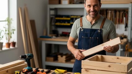 Caucasian man holding wood plank in workshop. Carpenter working on wooden crate. DIY, hobby, and small business concept footage.