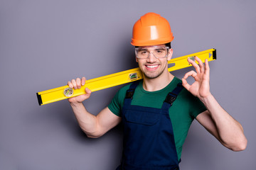 Good work. Photo of handsome timber guy skilled engineer hold measure meter rack show okey symbol wear t-shirt safety dungarees helmet glasses isolated grey background