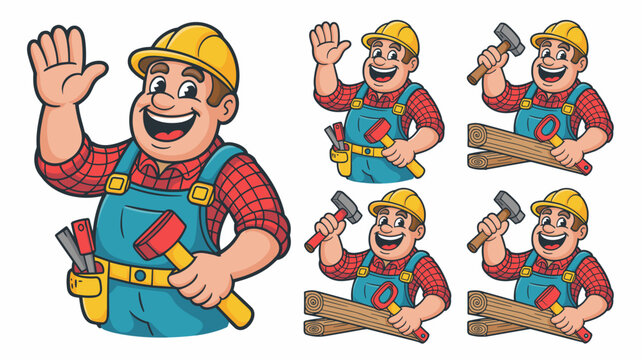 Cheerful professional construction worker mascot or friendly cartoon handyman in yellow hard hat and overalls, holding hammer, lumber, and carpenter tools, providing renovation, repair, and reliable b