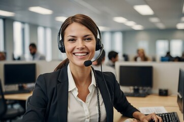 Enthusiastic brunette woman with a headset in a busy office environment offers customer service, managing calls and promoting customer satisfaction.