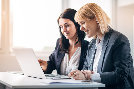 Response a cheerful customer service representative gestures at a sleek laptop in a vibrant office.