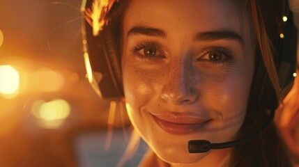 Smiling Woman Wearing Headset at Sunset - Generative AI