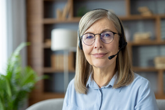 Portrait of a senior businesswoman wearing a headset, working as customer support in a modern office. She smiling confidently, representing professionalism, experience, and effective communication.