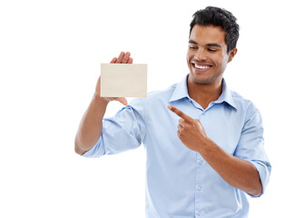 Mockup, happy man or hand pointing to business card in studio for startup, promotion or marketing on white background. Paper, recruitment or male agent we are hiring space, contact us or information
