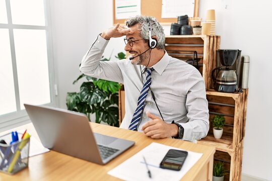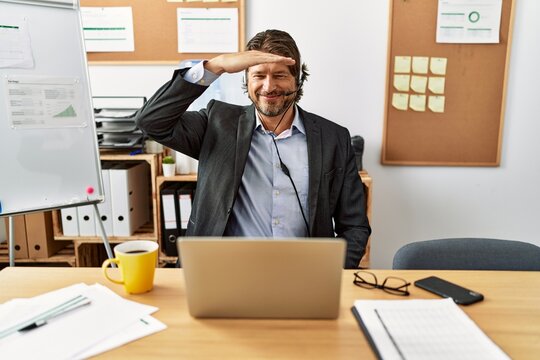 Handsome middle age man wearing call center agent headset at the office very happy and smiling looking far away with hand over head. searching concept.