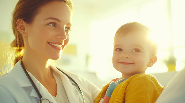 Pediatric healthcare professional providing compassionate care to a smiling child in a sunny clinic, promoting health and wellness.