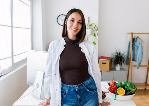 Beautiful young nutritionist looking at camera and holding fresh vegetables in the consultation.
