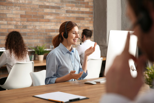 Happy smiling call center agents working in office with headset. Consultant providing customer service support, online assistance. Man with headphones talking at computer monitor screen.