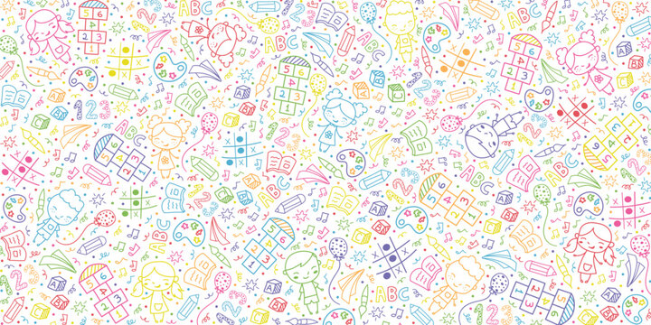 Diverse colorful people crowd seamless pattern illustration set. Funny cartoon characters in cute children doodle style. Friendly community, kid emotion psychology background collection.