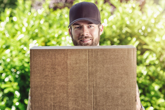 Delivery service. Young Caucasian man with a parcel next your door. Swift and diligent, he carries parcels with care.