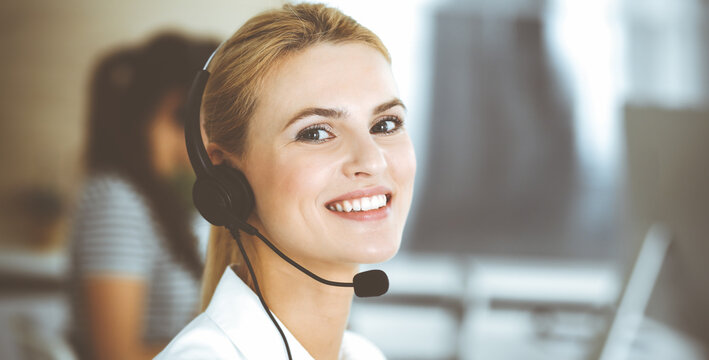 Blonde business woman using headset for communication and consulting people at customer service office. Call center. Group of operators at work