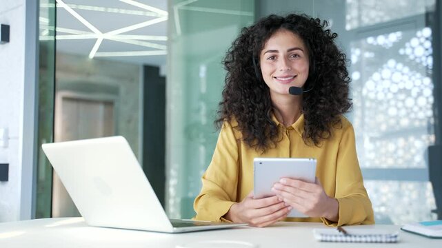 Portrait of a young smiling female call center agent with a digital tablet sitting at desk at workplace in business office. Happy woman in wireless headset customer service operator looking at camera